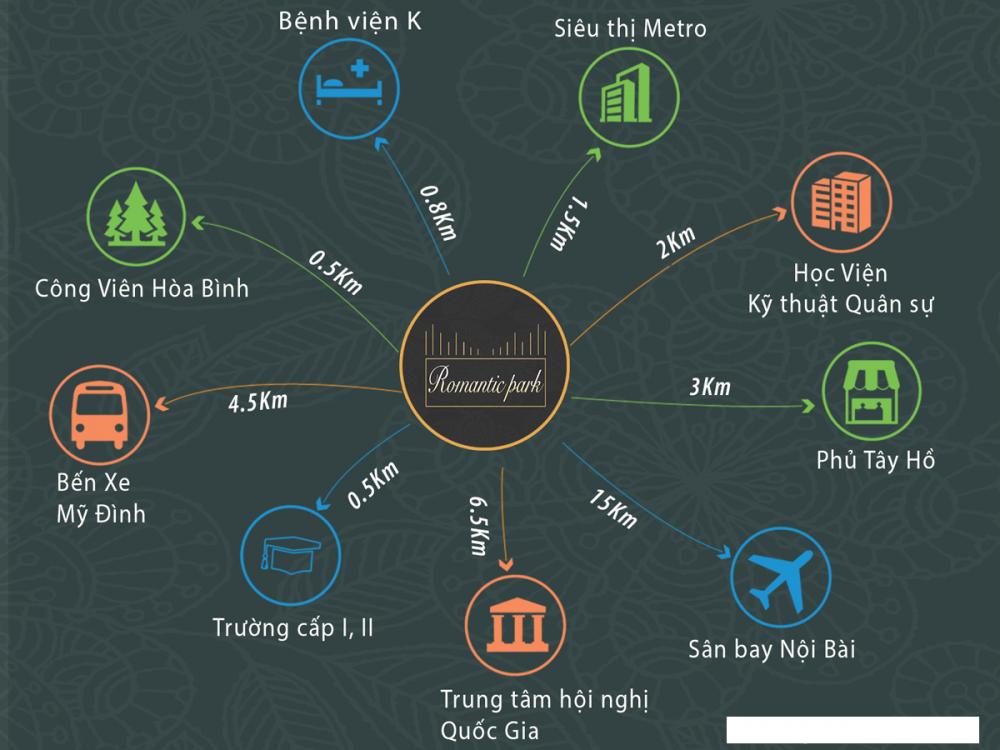Liền kề Romantic Park là 1 quần thể hỗn hợp các tiện ích hiện đại, hạ tầng kỹ thuật đồng bộ, kết nối ngoại khu thuận tiện: