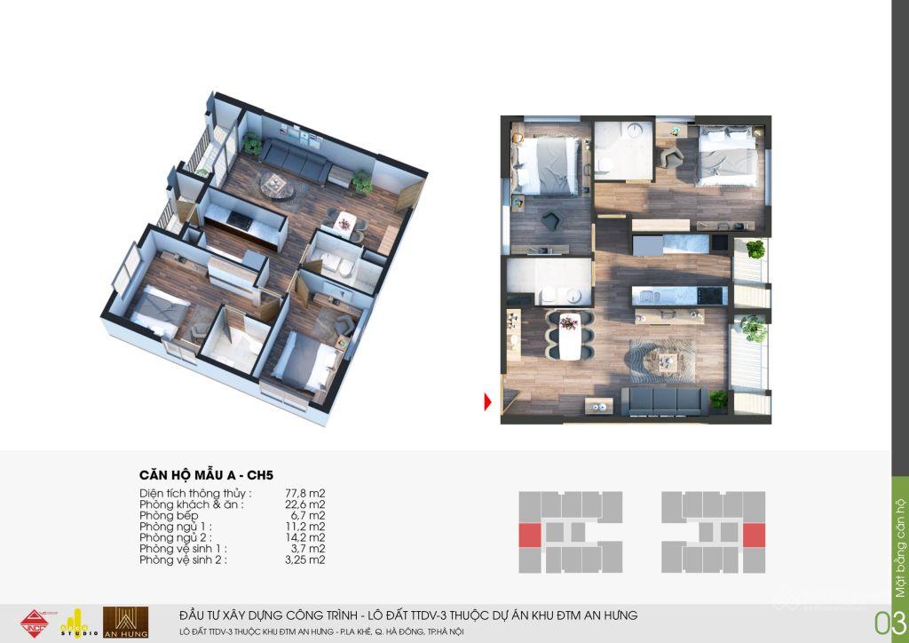 - Căn hộ CH5: diện tích 78m2, 2PN 2VS