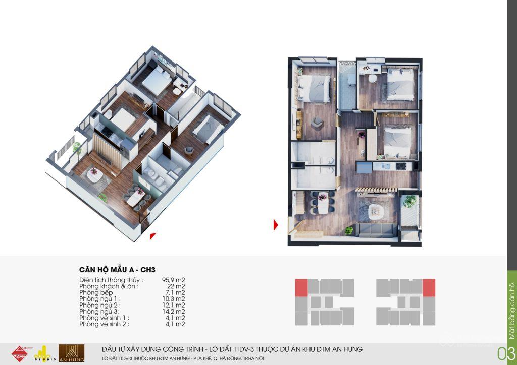 - Căn hộ CH3: diện tích 97m2, 3PN 2VS