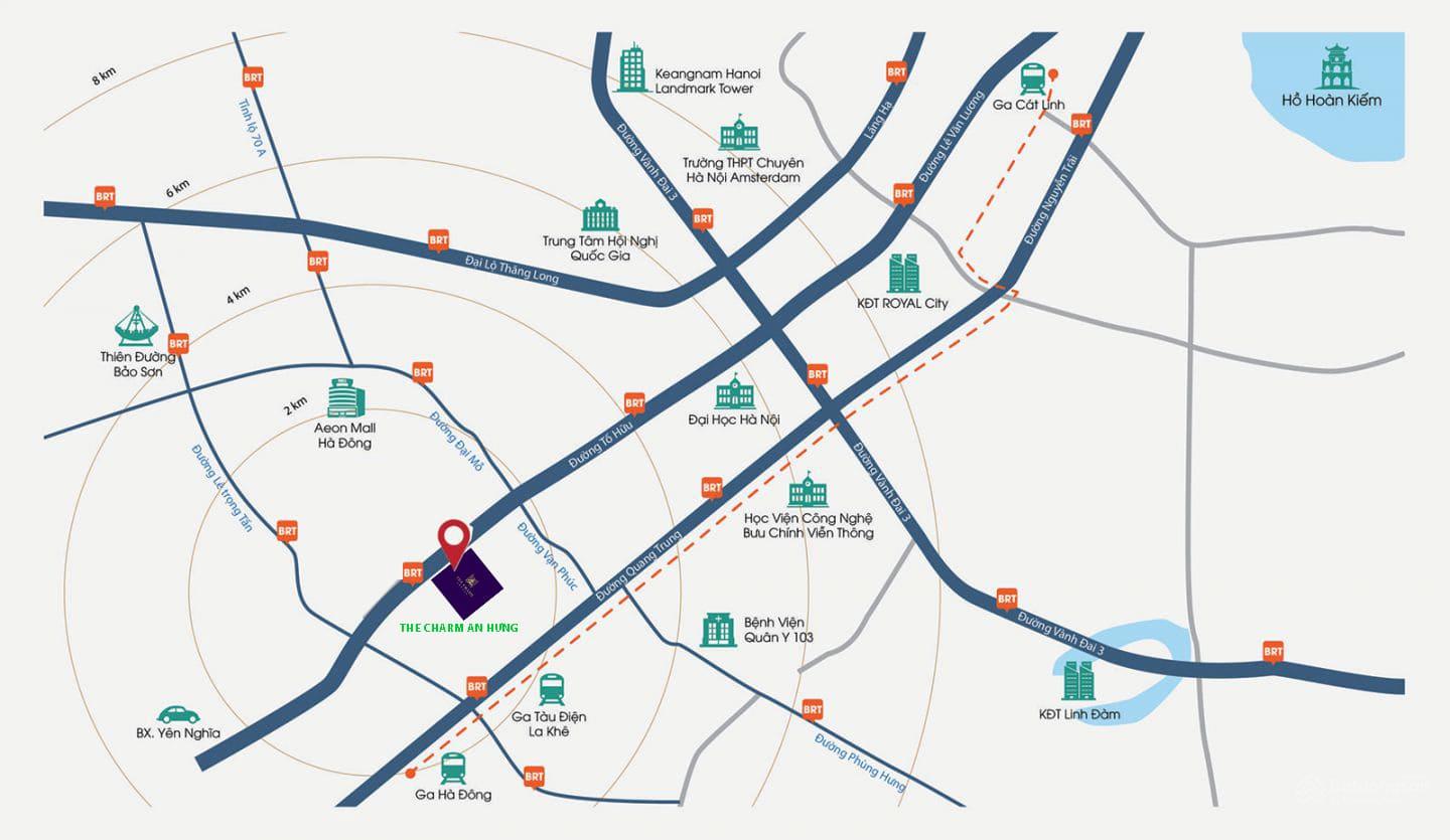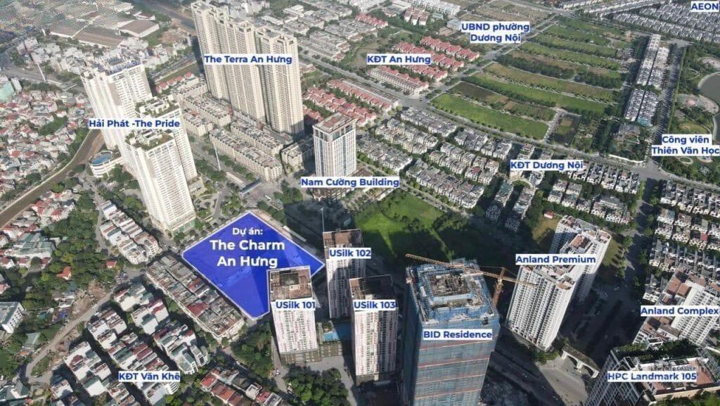 Dự án The Charm An Hưng được quy hoạch tại lô đất trên mặt đường Tố Hữu, giữa 2 tòa chung cư The Pride và Usilk, gần kề các khu đô thị lớn của quận Hà Đông như KĐT An Hưng, KĐT Dương Nội, KĐT Văn Khê, KĐT Park City. Đây là khu vực tập trung nhiều dự án chung cư, biệt thự, liền kề với hạ tầng đồng bộ, nhiều tiện ích nổi bật hàng đầu Hà Đông như Công viên thiên văn học, Aeon Mall, hệ thống các trường học, bệnh viện lớn,…
