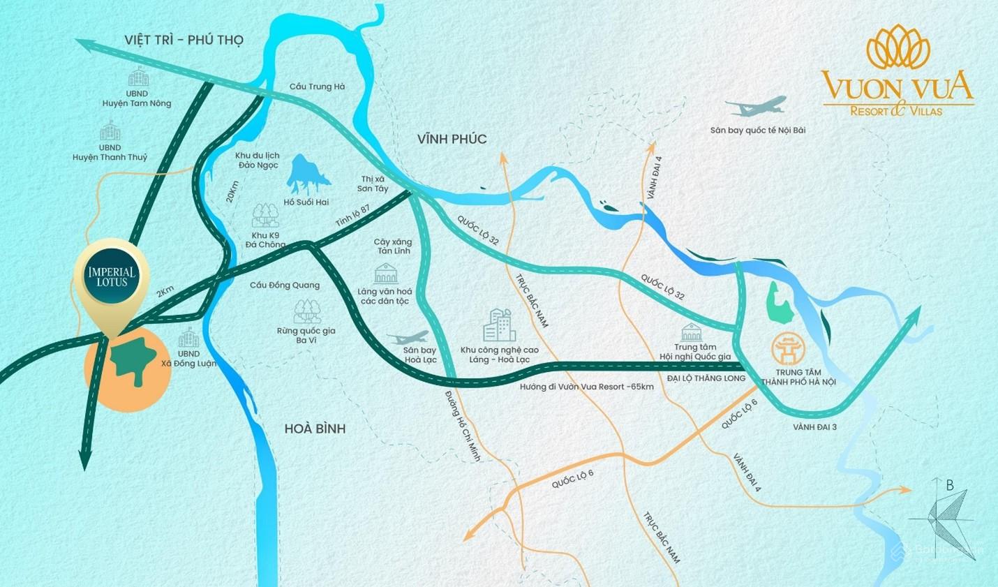 Từ thủ đô Hà Nội đến dự án Vườn Vua resort & villas theo tuyến đại lộ Thăng Long - Làng Văn hóa các dân tộc Việt Nam - Tản Lĩnh - Đá Chông - Cầu Đồng Quang chỉ còn khoảng 60 km, với thời gian di chuyển chỉ 50 phút điểm đầu di chuyển Big C.